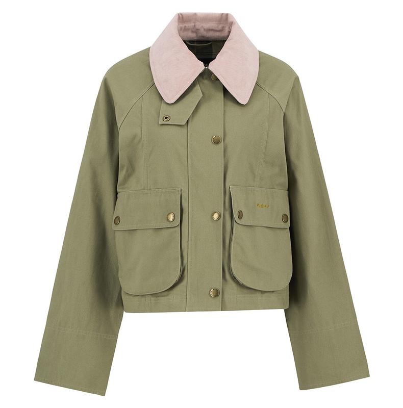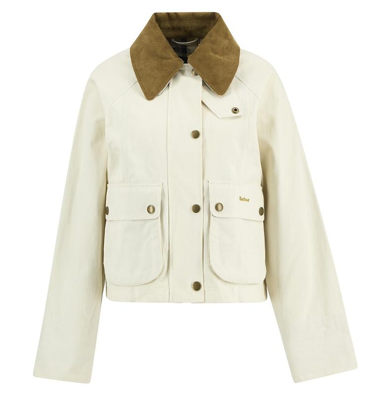 Cropped length version of traditional Barbour Beadnell style. Detachable cord collar and tartan to turn up cuffs. Large bellow pockets are the main feature.