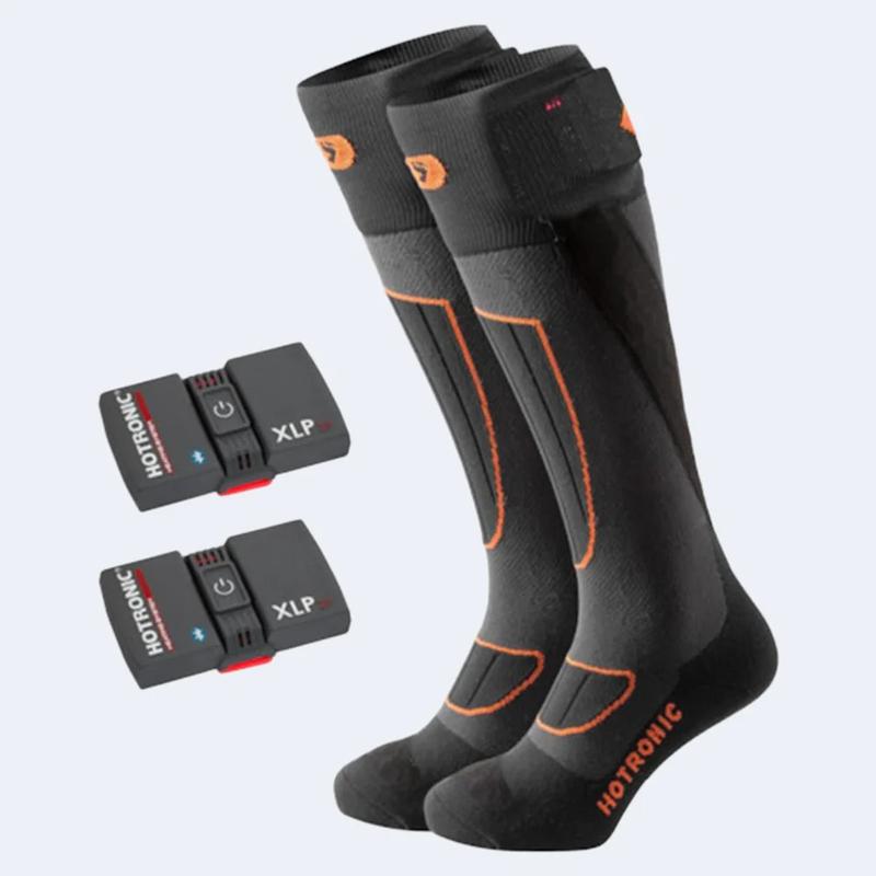 Cold feet spoiling your winter? The Heat Sock Set XLP 2P BT Surround Comfort is the absolute best when it comes to combining flexibility, warmth, and longevity into a foot heating system. Socks.. these are socks.. so they can go into any of your winter boots, from your hikers to your ski boots, and even into bike shoes to extend your biking season. This complete kit combines a pair of HOTRONIC XLP 2P BT Battery Packs with the Soft Compression and Surround Heating Element in a Surround Comfort sock. The battery has Bluetooth, so you can control the heat settings, keep abreast of the battery power, and set your elements to stand-by mode when you’re in the lodge for coffee. The socks’ Surround Heating Element envelopes your tender toes with constant heat. The batteries ride on the sock cuff, with power wires positioned along the lower leg and wrapping ergonomically around the Achilles and under the arch before delivering heat to the top and bottom of your toes. The XLP socks feature a graduated compression for fit, warmth and recovery, in a wool blend with a cushioned fit. The battery pack XLP P is the next level of lithium-ion constant heating power with the best size-to-capacity ratio, and longevity, on the market, a full 18 hours of capacity! When you’re going to be out there for hours, or want to run your socks hot, these are the socks to choose!