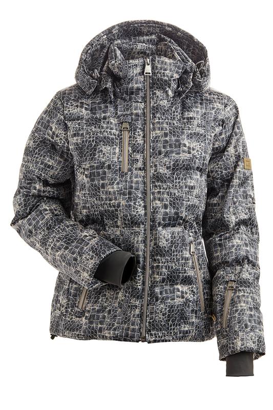 Print ski/snowboard puffer jacket. This jacket features 2 handwarming pockets, a sleeve pass pocket, a chest pocket, and a helmut compatible hood. This jacket is made with a 4-way stretch fabric and is designed with custom trims and YKK zippers.