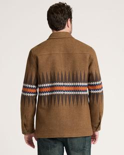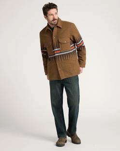 Crafted from warm wool the body is unlined and sleeves lined for comfort. This rugged jacket features a vintage-inspired Pendleton-exclusive pattern that flows from front to back across body and sleeves. Inspired by early hunting jacket styles, this heritage-style jacket has a snap front, two large chest pockets with snap-closure flaps, two lower welt pockets and one inside lining pocket. Inside story patch describes the fabric and pattern.