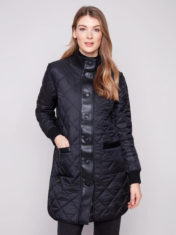Enhance your fall wardrobe with this versatile quilted puffer jacket in black. It boasts a chic reversible design, offering both a solid and tone-on-tone black leopard pattern. The rib-knit cuffs and neck add a cozy touch, while the snap button closure an easy fit. Ideal for staying warm on chilly days, this jacket seamlessly blends style and practicality.