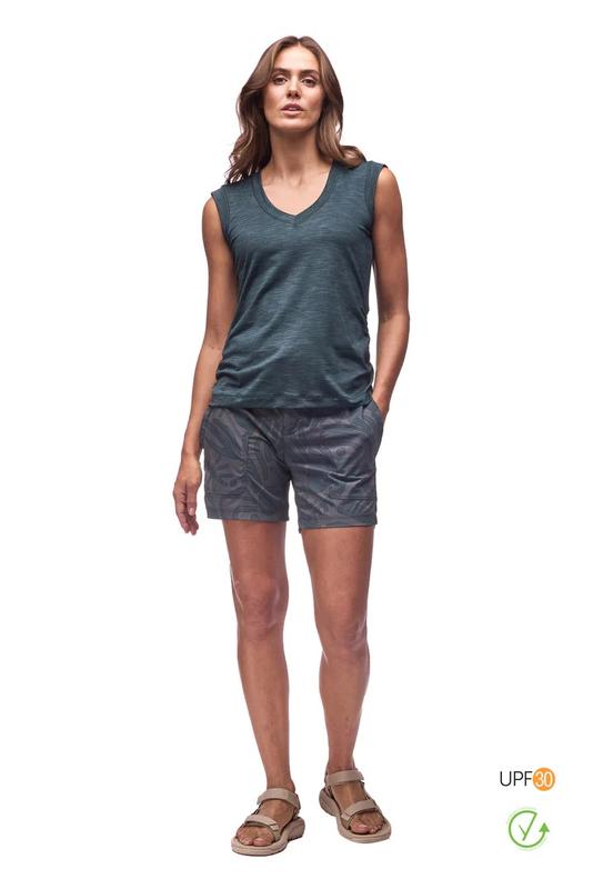 Sleeveless v-neck top with ruching on the sides. Wear more, wash less.