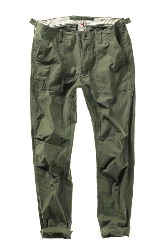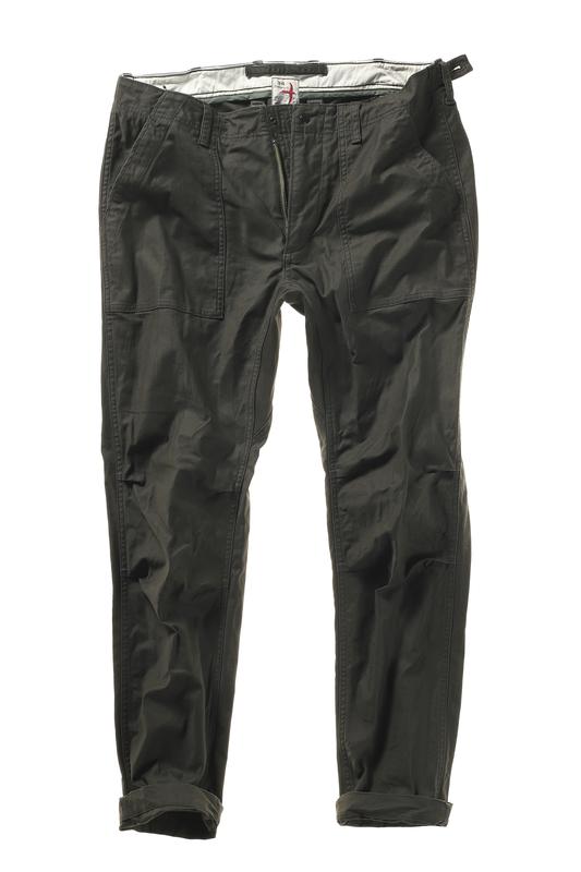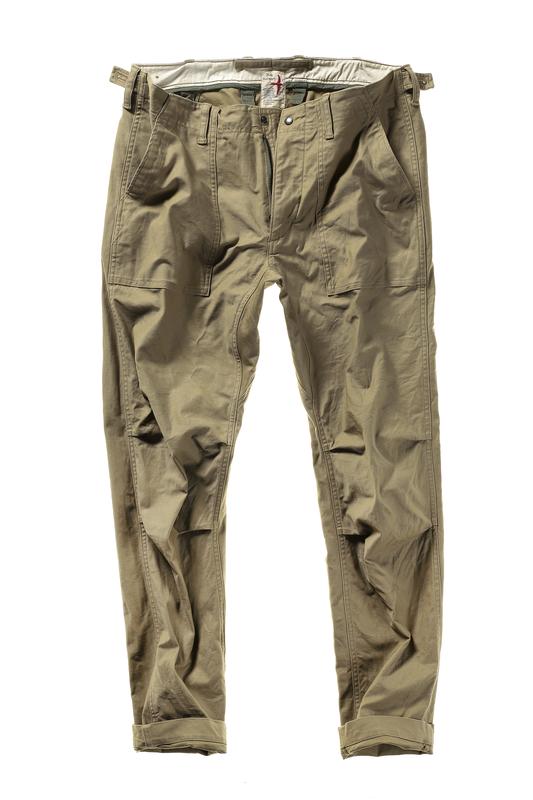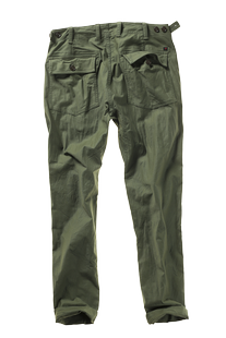 • ?faithfully constructed U.S. military utility trouser of '50s and '60s era, front pockets rolled with seam allowance forward of entry, back pockets cut wider than sewn width for excess fullness