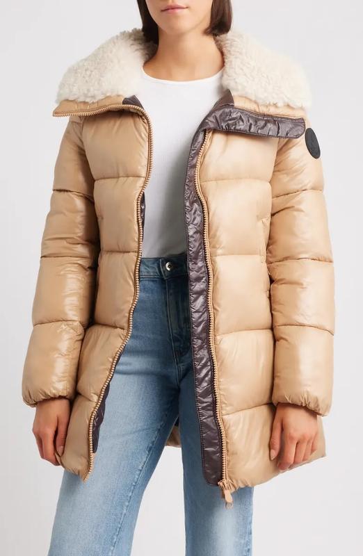 A cozy shawl collar lined in faux shearling zips up to become a windblocking stand collar on this A-line puffer jacket made from recycled nylon.